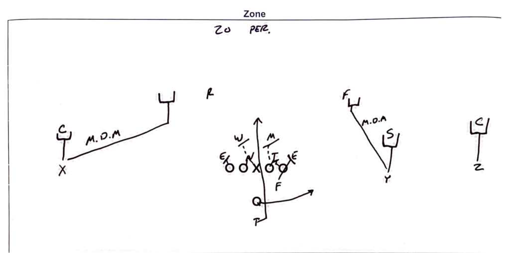 This article is not about reinventing the RPO but to look at them from a different perspective. Field and Boundary reads. To look at some zone-read RPO’s, let first look at the inside zone blocking scheme from 20 personnel or 2 back gun.