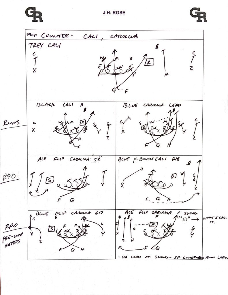 - “Ace Flip Carolina F-Swing” is a RPO designed for the QB. If the Swing route gets covered the QB tucks the ball and runs Carolina.